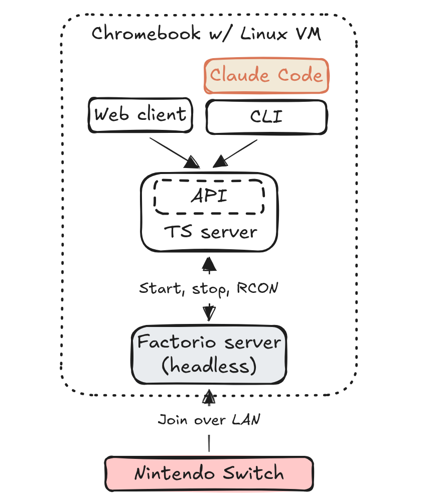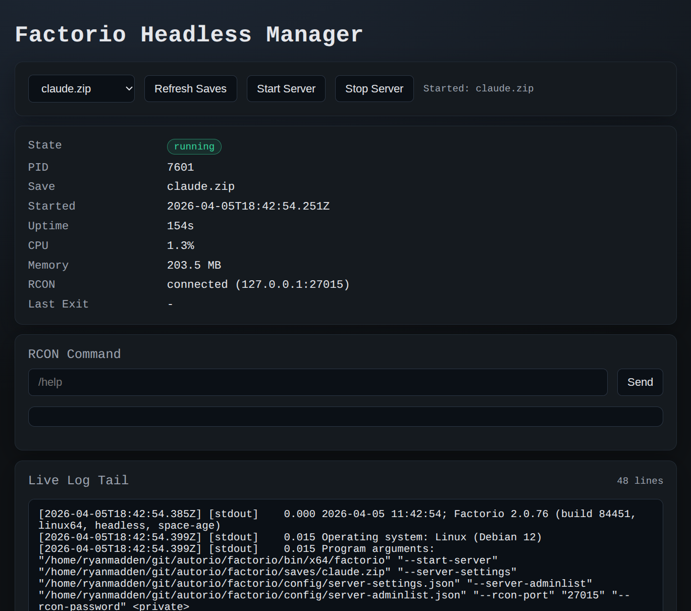 We could have implemented the Lua/RCON commands in the CLI, but instead we opted to build a TypeScript server to manage the game and send commands. We wanted extra abilities for monitoring and debugging that wouldn’t be included in the CLI: the ability to start and stop game servers, see the server status and logs, list and load saves, and send arbitrary RCON commands.